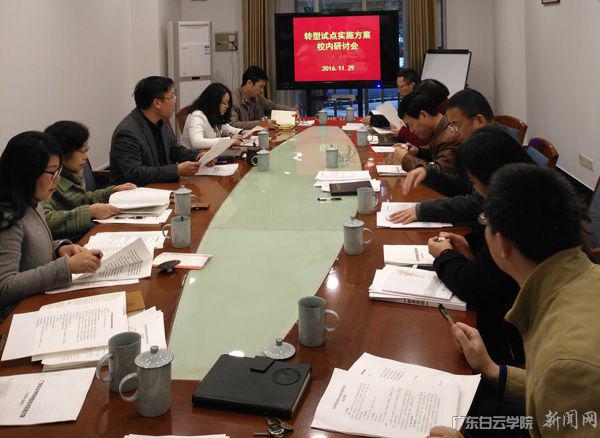 2016年11月29日,我校转型试点实施方案校内研讨会在第二会议室举行。学校校长黄大乾、党委书记刘剑锋、党委副书记李纯英、副校长刘跃南、副校长沈根生,教务处等职能部处负责人以及院校发展研究中心全体老师参加了本次校内研讨会。